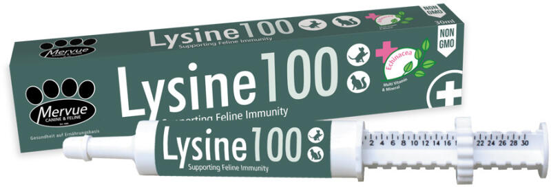 A Mervue Lysine 100 paszta egy L-lizint, Echinacea-kivonatot és természetes nyomelemforrásként tengeri hínárt (Laminaria hyperborea) tartalmazó ízletes paszta, speciálisan a macskák immunrendszerének támogatására fejlesztve. Adagolófecskendőben kapható.